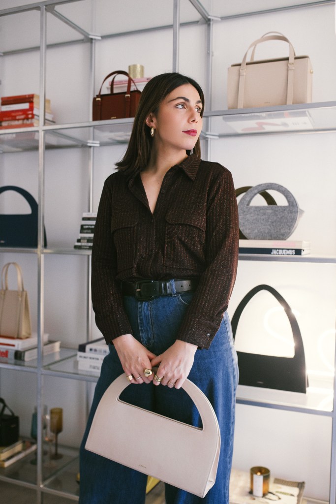 “Intendo la comodità come il sentirsi a proprio agio con quello che si ha addosso” – In questo contesto, l’abbigliamento gioca un ruolo fondamentale. Per Sofia, deve essere innanzitutto versatile, adeguato sia per al giorno che per la sera, combinando praticità e raffinatezza. Questa capacità di adattarsi a diverse occasioni è uno dei pilastri del concetto di comodità che ispira sia il suo brand che la nostra proposta. Ogni capo deve riflettere la sua personalità, fondendo armoniosamente elementi femminili e dettagli dal tocco maschile. Un esempio perfetto è la camicia MABEL, scelta per l’intervista: il tocco di lurex e il taglio deciso la rendono elegante e dinamica.