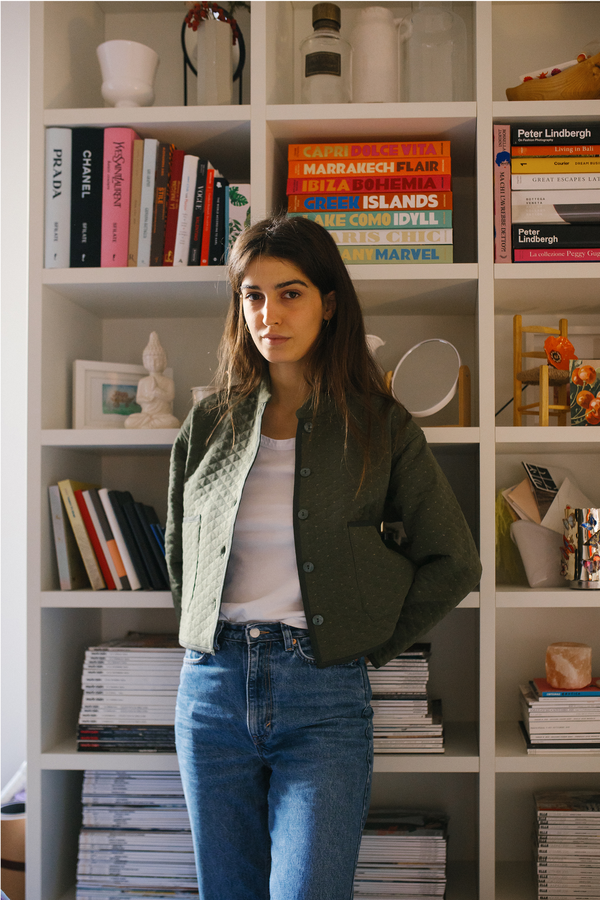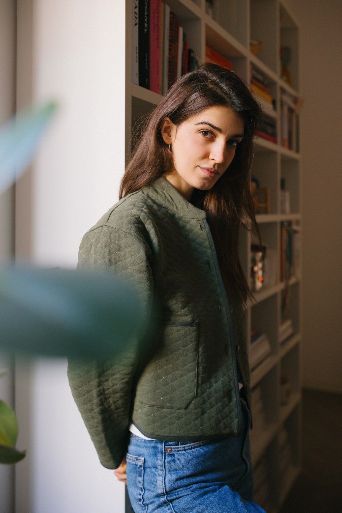 “Ci tengo moltissimo all’aspetto di comfort.” Per Giorgia, l’abbigliamento è strettamente legato al processo creativo. Sentirsi a proprio agio è fondamentale, sia quando lavora da sola che durante eventi pubblici. Spesso sceglie capi che richiamano persone care, come la giacca Cora quilt militare, che unisce il verde preferito dal padre, il blu amato dalla madre e un design che favorisce comfort e libertà di movimento. Altre volte, opta per completi che combinano eleganza e praticità, come il look Alison e Portogallo in arrow nero, arricchito da dettagli luminosi in lurex. Un outfit ready-to-wear che aggiunge un tocco speciale senza bisogno di gioielli, perfetto come il suo porridge to-go, che ama preparare prima di un viaggio o durante quelle mattine frenetiche.